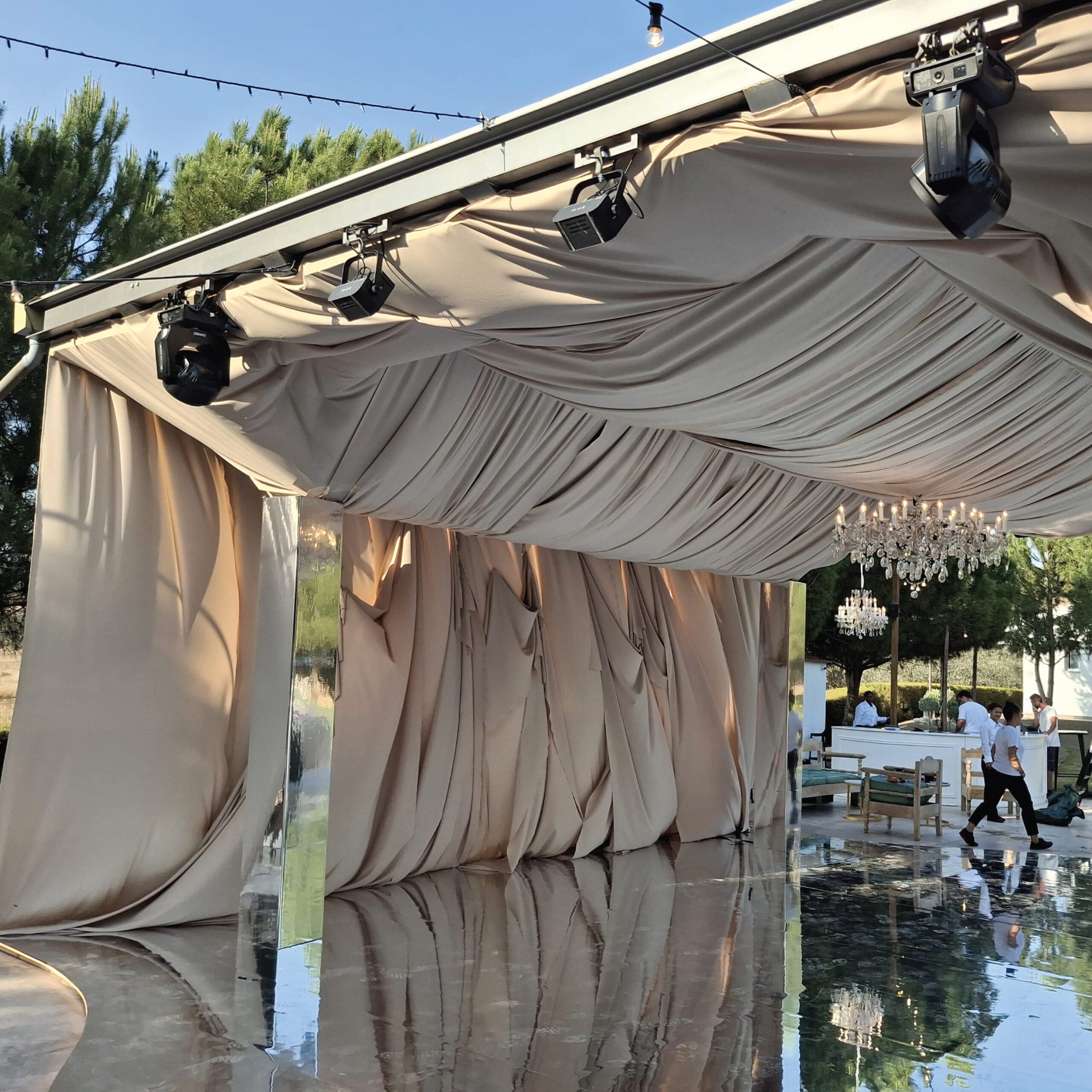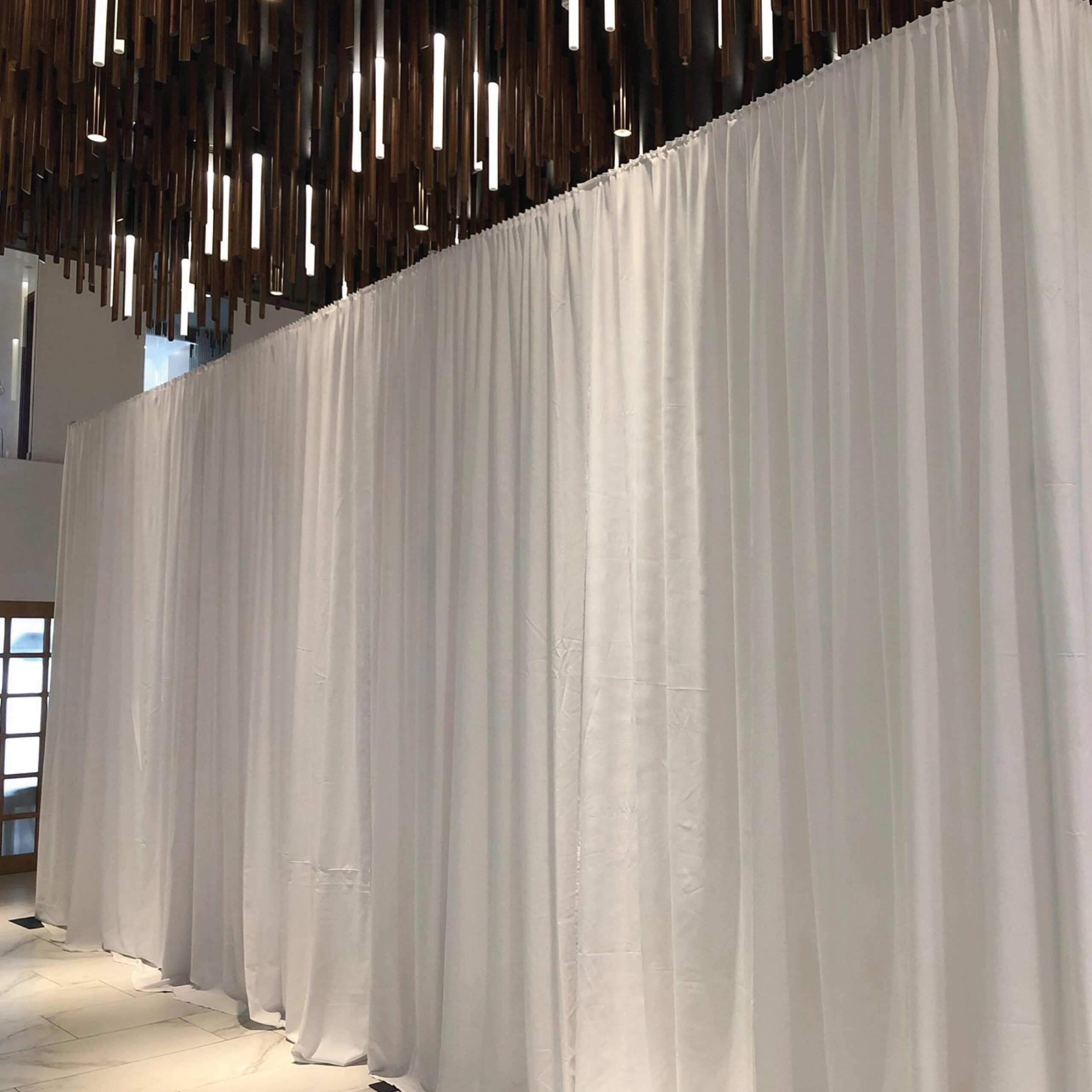 Professional draping systems for walls, ceilings and space division, creating clean, elegant and controlled event environments.