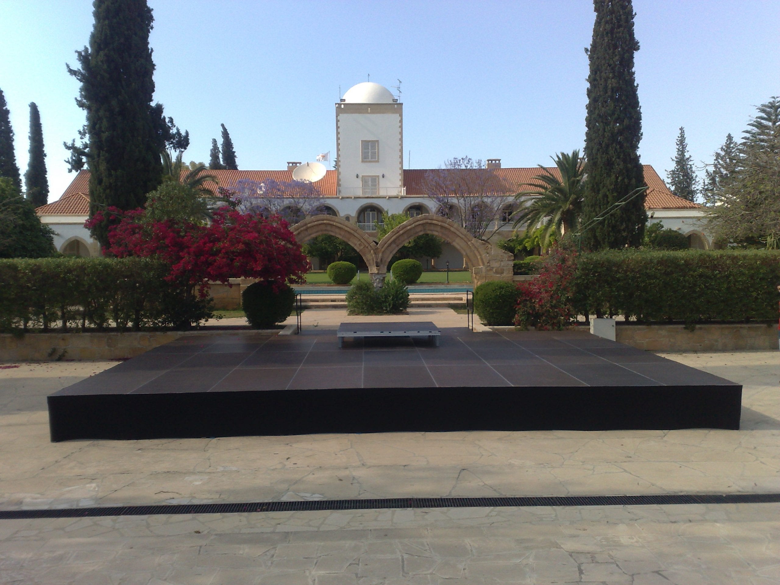 Stages with anti-slip and waterproof floor, stages in natural timber color or covered with carpet or sticker in the color of your choice and all the necessary accessories such as stairs, rails and ramps.